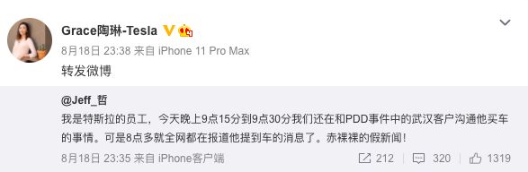 8月18日晚23点35分,微博名为Jeff_哲的特斯拉员工发微博称:“我是特斯拉的员工,今天晚上9点15分到9点30分我们还在和PDD事件中的武汉客户沟通他买车的事情。可是8点多就全网都在报道他提到车的消息了。赤裸裸的假新闻!”随后,特斯拉对外事务副总裁陶琳转发了该员工微博,被认为是在表明特斯拉对此事的态度。