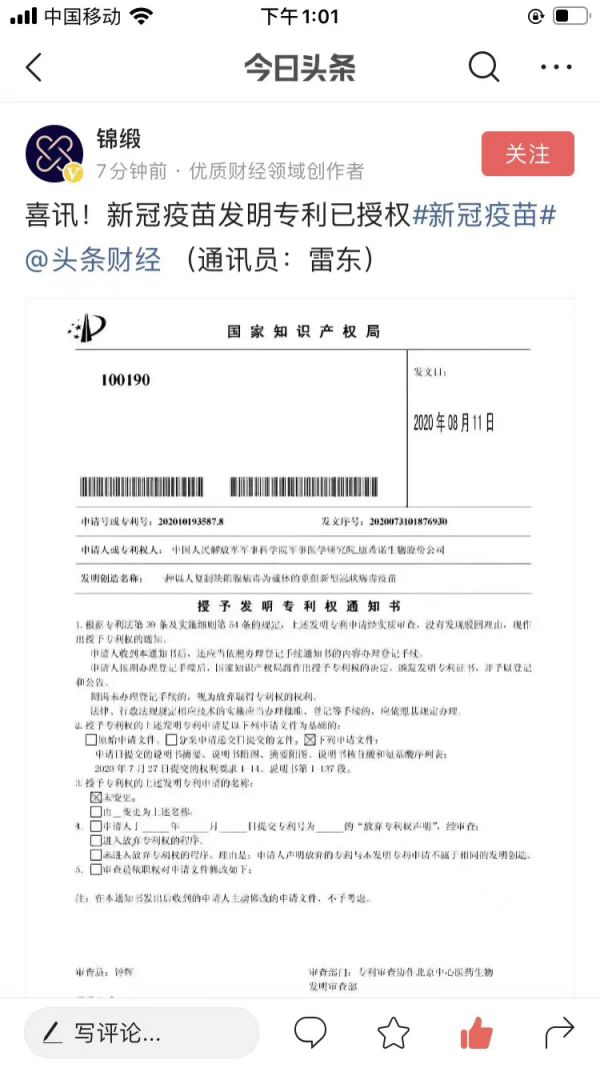 图2:国内首个新冠疫苗专利已于8月11日获批