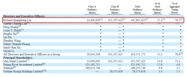 图5:据2019年报,刘强东直接持股15.1%,投票权为78.5%。