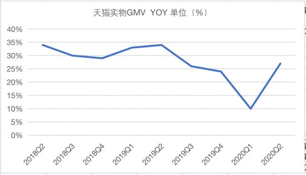 近2年来天猫实物GMV同比增速,制图:36氪