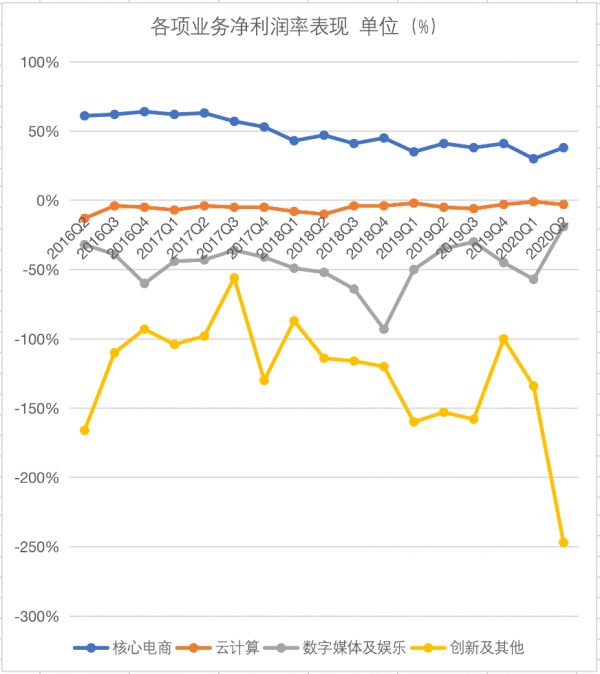 以本季度为例,集团整体的净利润率为23%,而核心电商业务的净利润率高达38%,这意味着核心电商业务为集团一直在弥补他业务亏损的钱。