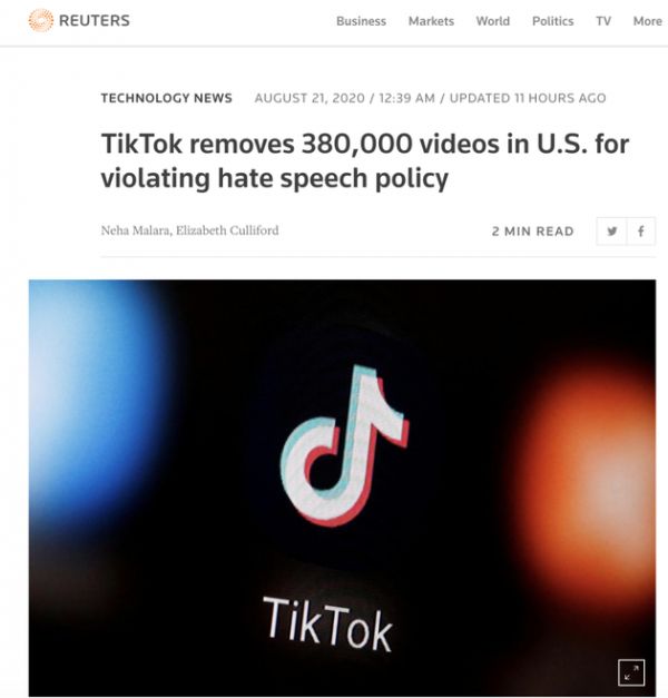 据路透社21日报道,短视频应用TikTok周四表示,截至目前,TikTok在美国已删除超过38万个视频,原因是这些视频违反了公司的仇恨言论政策。TikTok还表示,已经禁止了1300多个发布仇恨内容的账户。