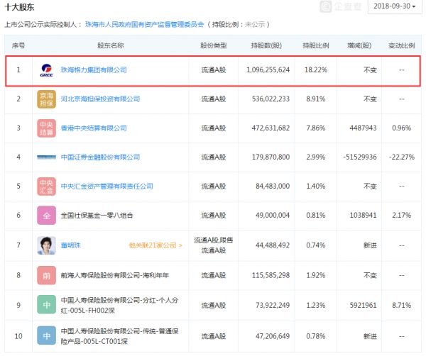 据企查查的最新数据,珠海格力集团目前是格力电器的第一大股东,持有格力电器18.22%的股份。河北京海担保投资、香港中央结算等公司也持有较大比例的格力电器股份。