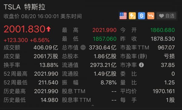 昨夜,特斯拉股价再次逆天。截止收盘,特斯拉报收2001. 83 美元,股价首次突破 2000 美元大关。一夜之间,特斯拉市值飙升230亿美金(约合1590亿人民币),已经突破3730亿美金。