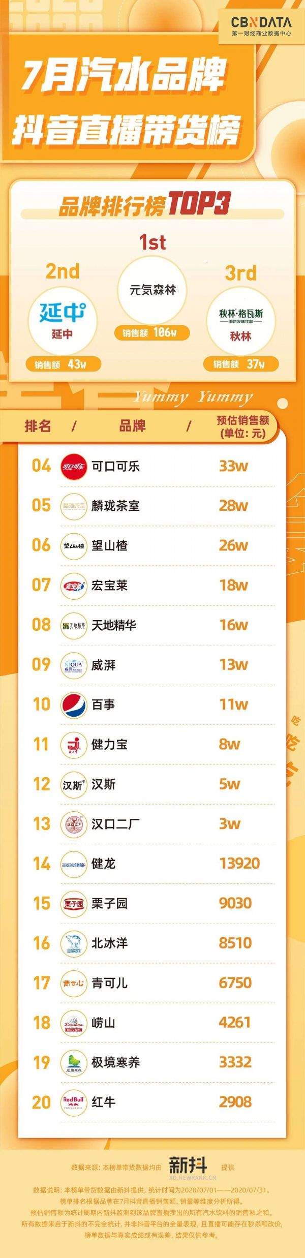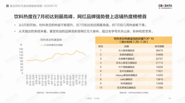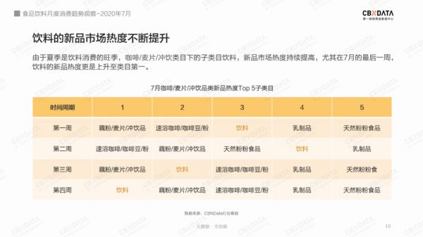 第一财经商业数据中心(CBNData)发布的《2020年7月食品行业月度消费趋势观察》(以下简称CBNData报告)也显示,饮料类目新品热度在7月份不断提升,并于7月最后一周成为类目第一。