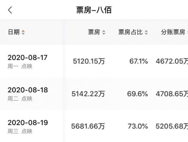 17日当天,《八佰》点映票房已突破5000万,创下影院复工以来单片单日票房纪录,并将大盘票房推高至超7000万。往后三天时间内,《八佰》一直保持每天点映5000万以上的好成绩,大盘体量也每天维持在7000万以上。