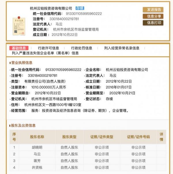 8月23日,据工商登记信息显示,杭州云铂投资咨询有限公司发生股权变更,马云将其持有的66%股权平均转让给井贤栋、胡晓明、蒋芳三人。转让完成后,马云在杭州云铂的持股比例降至34%,井贤栋等三人分别持股22%。