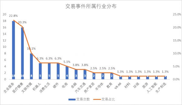 在赛道分布看,本周Top 3热门融资赛道分别为:企业服务(18笔,占比22.8%)、医疗健康(16笔,占比20.3%)、文娱传媒(8笔,占比10.1%)。企业服务行业独占18笔,持续获得资本青睐。