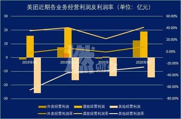 外卖是美团的主营业务,也可以说是美团的顶梁柱。2020年第二季度,美团外卖业务收入145.4亿元,同比增长了13.2%,且该业务经营利润达到了美团酒旅经营利润的66.2%,这样的比例是前所未有的。同时,相较于美团外卖最强劲的对手饿了么,美团的恢复速度也更好,环比增速达到了53.3%,而饿了么的环比增速为46.7%。