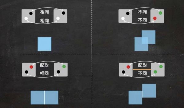 现在,当两个骰子的相同位置的点有不同的颜色,而另一个位置的点的颜色不仅不同,且颜色配对(红和绿,或者黑和白)时,就将这两个骰子骰子用直线连接起来,如下图中的第四种情况,就满足用线连接的条件。