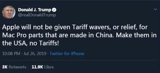 特朗普对此也想通过关税来说服苹果回迁,表示“不会给苹果Mac Pro电脑的中国造零部件减免关税。在美国制造这些零部件,就没有关税!”