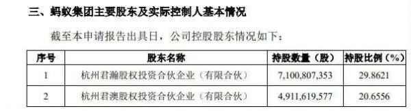 文件还披露了蚂蚁集团的主要股东,截止该份文件出具日,其控股股东包括:杭州君瀚股权投资合伙企业(有限合伙)、杭州君澳股权投资合伙企业(有限合伙),持股比例分别为29.8621%、20.6556%。