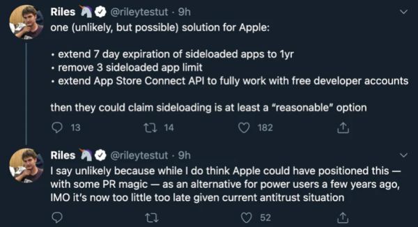 编者按:游戏巨头Epic与苹果之间的冲突愈演愈烈。因为违反应用商店的内购政策,苹果让Epic的《堡垒之夜》移动版全面下架,而前者一怒之下将手机巨头告上法庭。一方的理由是高昂的“苹果税”,另一方的理由是要为消费者把好关。既然如此,苹果到底能不能包容第二个应用商店的存在呢?暂时来看,有人找到了一个另立门面的漏洞,只是要看苹果会不会封杀它了。如果会的话,那就跟他们当年“向疯狂的家伙致敬”的精神完全背道而驰了。本文编译自对冉冉升起的苹果“应用商店”AltStore开发者Riley Testu的采访,原标题是:This app could end Apple's monopoly — and Steve Jobs would love it。篇幅关系我们分两部分刊出,此为第二部分