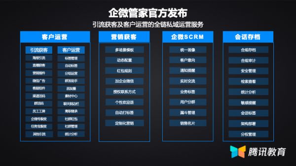 8月24日消息,腾讯教育今日发布基于企业微信的私域流量运营工具——企微管家,为教培机构提供从引流获客到客户运营的全链路服务,助力企业实现私域数字化营销。