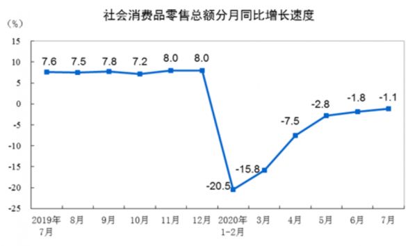 国家统计局数据,7月份销售额仍是同比负增长。在线零售已恢复到同比20%左右水平