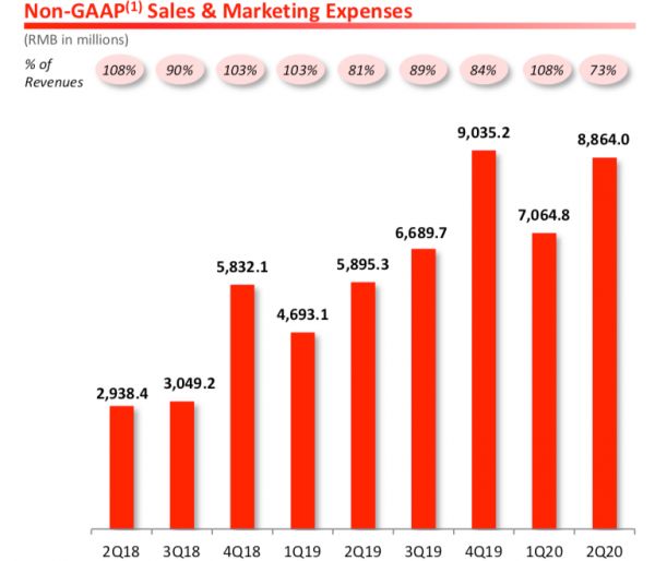 但如果看营销投入的绝对数额,二季度是88.6亿(Non-GAAP),基本上是与4Q19大促季的90.4亿(Non-GAAP)持平的,为历史上的单季度第二高。绝对值没减而百分比下降,主要和收入增长有关。