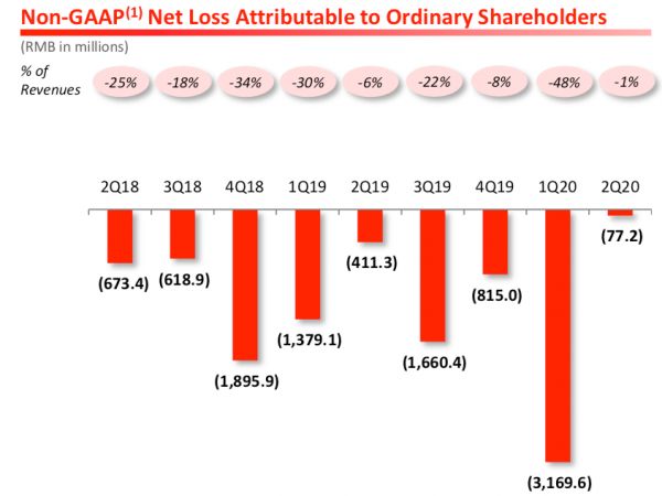 那么,在整体毛利率同比持平、环比改善,以及利息收入增加、投资的公允价值上升等综合因素下,拼多多二季度Non-GAAP准则下的归属股东净亏损收窄到-7700万,去年同期是亏损4.1亿,上一季度是亏损31.7亿。