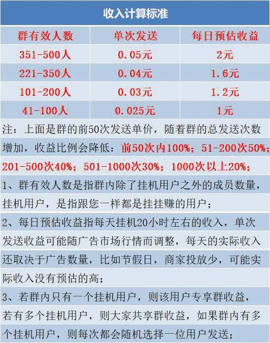 根据挂挂赚账号后台“收入计算标准”,一个有效人数为41到100人的群,单次发送广告链接的收入为0.025元,每日预估收益为1元;而一个有效人数为351到500人的群,单次发送广告链接就可以得到0.05元佣金,每日可以预估收益2元。总的来说,群内有效人数越多,“挂机”人数越少,则代理收益越高。