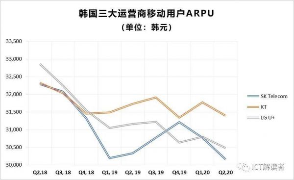 然而随着5G手机用户增速放缓,韩国三大运营商的移动用户ARPU自2019年四季度开始却再度掉头向下,到2020年二季度SK Telecom的移动用户ARPU环比下降了2%,同比下降了0.6%;KT环比下降1.2%,同比下降1.1%;LG U+环比下降1%, 同比下降了2.2%。