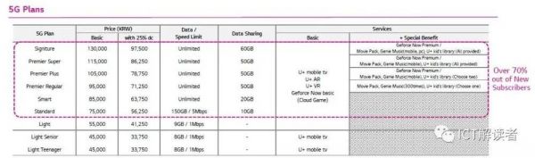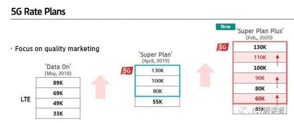 为了吸引4G的高端用户升级5G提升ARPU,韩国三大运营商主推5G不限流量套餐,而且还不断通过促销拉低5G资费门槛。以KT为例,其最低档的5G套餐资费已经处于4G套餐的中位水平。