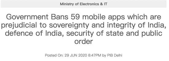 印度称,禁用这些应用的原因是它们“参与了损害印度主权和领土完整、国防、国家安全以及公共秩序的活动”。