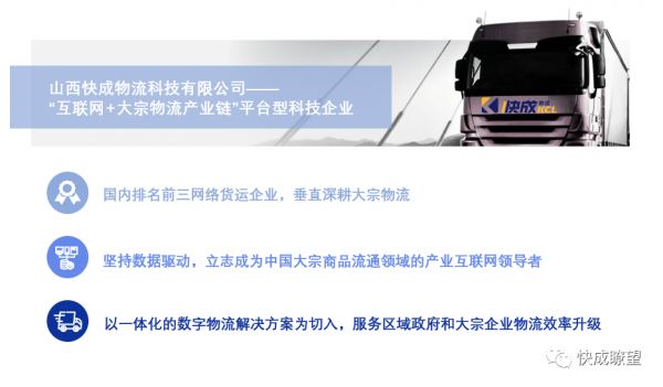 面对以上行业痛点和难点,山西快成物流科技有限公司作为中国领先的“互联网+大宗物流产业链生态”的平台型科技企业和大宗智慧物流解决方案专家,以向政府和大宗企业提供一体化的数字物流解决方案为切入,通过数字化解决方案满足大宗企业物流效率升级和地方政府治理升级的需求,同时为辖区企业客户提供网络货运服务,并向上下游企业、司机、商户游提供全链条服务。
