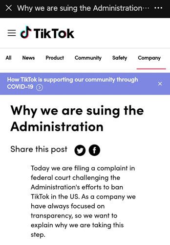 字节跳动方面表示,美国政府于2020年8月6日发布的行政命令有可能剥夺TikTok社区的权利,但没有任何证据证明这种极端行为是正当的,也缺乏任何正当程序。公司强烈反对美国政府的立场——即TikTok是对美国国家安全的威胁。“现在是我们采取行动的时候了。我们不会轻易起诉政府,但我们别无选择,只能采取行动来保护公司、以及社区和员工的权利。”字节跳动方面表示。