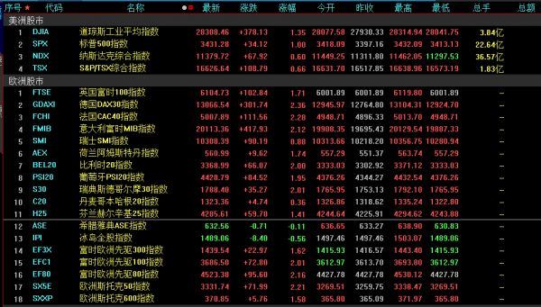 美股三大股指在本周一全部收高,其中标普500指数史上第一次收于3400点上方,与纳指一同创下收盘新高。欧洲三大股市在周一均跳涨2%左右。泛欧斯托克600指数上涨1.6%,创两周来最佳单日表现。