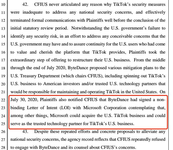 起诉书内容显示,字节跳动于7月30日向美国海外投资委员会(CFIUS)通知,已经和微软签订了“无约束力意向书”,透露微软将收购TikTok的美国业务,起诉书中,字节跳动称微软为“TikTok美国业务值得信赖的技术合作伙伴”。