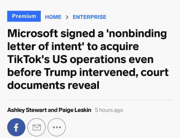 美国当地时间8月24日,据美国《商业内幕》杂志报道,字节跳动起诉特朗普及美国政府的诉状显示,早在美国总统特朗普介入前,微软公司竞购TikTok美国业务的动作已经到了与TikTok母公司签署“无约束力意向书”的地步。