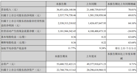 根据最新财报,立讯精密上半年录得营收364.52亿元,同比增长70.01%;归属母公司所有者净利润25.38亿元,同比增长69.01%。