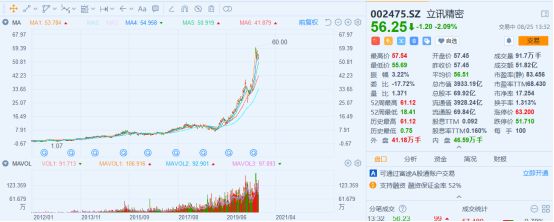 牛逼轰轰的立讯精密股价去年年初还只不过8块钱上下,去年一年便飙涨252%。今年势头不减,年内至今已再翻了一倍。短短两年间,立讯精密股价便大涨了六倍。截至今日最新,立讯精密股价报56.25元,最新市值3933亿元。