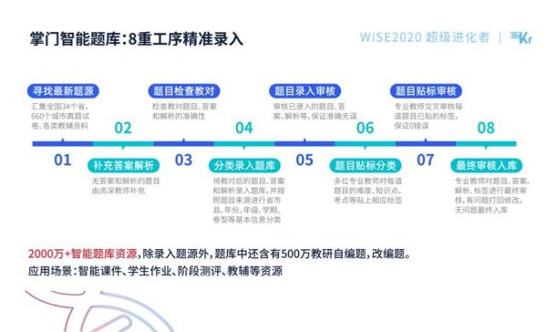 掌门智能题库经过寻找最新题源、补充答案解析、题目检查校对、分类录入题库、题目录入审核、题目贴标分类、题目贴标审核和最终审核入库8重工序,最终形成超过2000万智能题库资源储备,除了覆盖全国34个省、660个城市的真题试卷和各类教辅资料等录入题库外,还包括500万教研自编题和改编题。智能题库将会应用到智能课件、学生作业、阶段测评和教辅资源等重要场景,为实现“因材施教”的个性化教研提供重要助力。