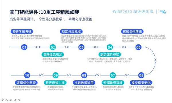 掌门智能课件则通过调研学情考情、课程体系规划、制定分层标准,制定课件框架、智能课件精编、视觉美化、资深教研审核、主讲教师试用、最终质检上线、定期优化升级10重工序精雕细琢。