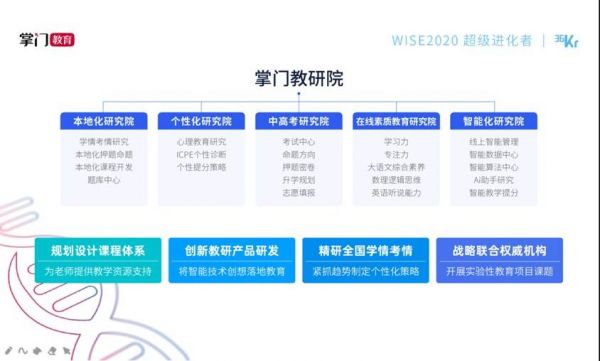 公开数据显示,掌门教育已拥有4000万注册用户,对于在线教研的探索始终围绕教与学的主体和场景开展。据悉,掌门已组建超万人的教研团队,这也是在线教育迄今为止规模最大的教研团队。设立本地化研究院、个性化研究院、中高考研究院、在线素质教育研究院和智能化研究院,分领域深耕整合教研资源,为前端教学提供针对性支撑,从而不断聚焦个性化教学效果的提升。