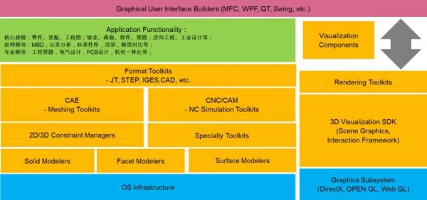 CAX软件的主要架构可以参考下图, 最底层青色部分是操作系统与计算机图形程序接口,这两者都与硬件有着密切的关系,橙色部分就是CAX软件产品的主要组件的类型。