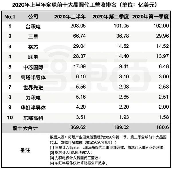 从2020年上半年全球前大晶圆代工营收来看,台积电的营收超过2~9名代工营收的总和。