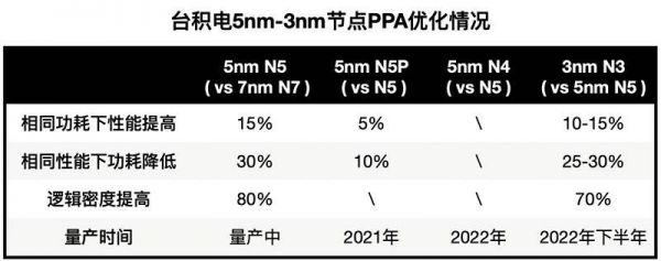相比5nm N5节点,台积电3nm N3在相同功耗下的性能可提高10%~15%,在相同性能下的功耗可降低25%~30%;逻辑密度提高70%,SRAM密度提高20%,模拟密度提高10%。