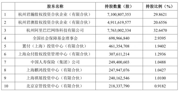 截至招股书签署之日,蚂蚁集团前十大股东