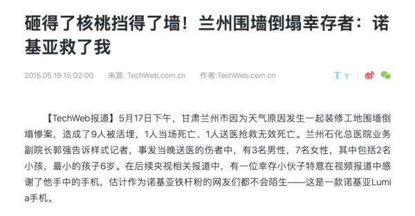 在“砸核桃”的本行上,Lumia 920也做得十分出色,在发布之后,网友们就对它进行了卡车碾压、百米跳伞等严苛测试,Lumia 920均以优异的成绩证明了自身的品质。2015年,兰州曾发生一起围墙倒塌事件,一位年轻人在情急之下用Lumia 920挡住了头部得以幸存,手机则只有屏幕破碎,机身都没有变形。