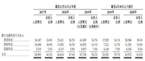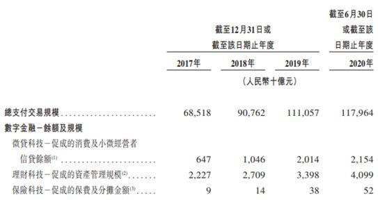 截至2020年6月30日,蚂蚁集团消费信贷余额为人民币1.732万亿元、小微经营者信贷余额为人民币4220亿元;资产管理规模为人民币4.099万亿元;保费及分摊金额520亿元。