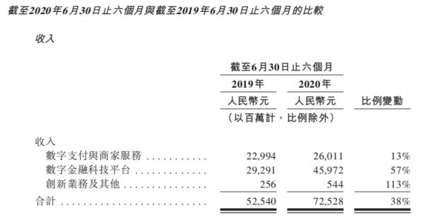 截至2020年6月30日止的六个月,蚂蚁集团数字支付与商家服务收入同比增长13%,而同期数字金融科技平台收入同比增长则高达57%。