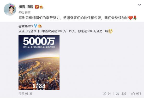 滴滴总裁柳青也在微博上对司机和乘客表达了感谢。她表示,“感谢司机师傅们的辛苦努力,感谢乘客们的信任和包容,我们会继续加油。”