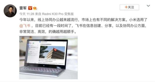 雷军对飞书的评价,图源雷军微博