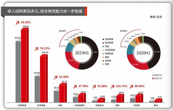 来源于顺丰中报 具体来看各项新业务,2020年上半年,顺丰的快运业务(含顺丰快运、顺心捷达)整体营收76.74亿元,同比增长51.30%;冷运及医药业务整体营收32.41亿元,同比增长37.78%;顺丰同城业务营收12.65亿元,同比增长61.06%,远高于行业增速;顺丰国际业务营收29.05亿元,同比增长141.71%;顺丰整体供应链业务营收29.57亿元,同比增长60.46%。