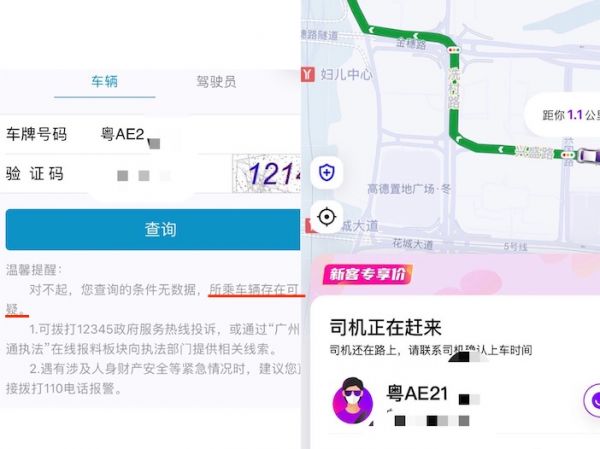 而时代财经在广州亲身体验的三单服务中,就发现有一单司机存在“无证”情况。时代财经在“广州交通执法”平台上查询该车车牌号码时,得到“所乘车辆存在可疑,可拨打政府服务热线投诉或报警”的提醒。