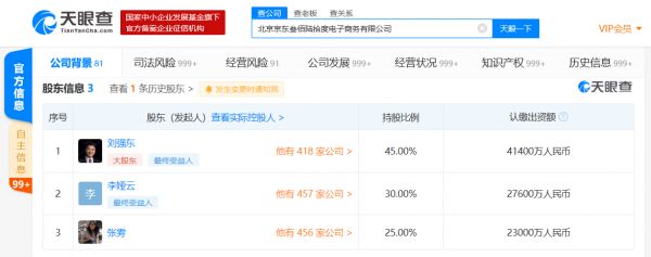 北京京东叁佰陆拾度电子商务有限公司成立于2007年4月,法定代表人为刘强东,注册资本9.2亿人民币,经营范围包括批发、零售机械设备、五金交电、电子产品、照相器材、计算机硬件及外围设备、化妆品及卫生用品等。刘强东持有该公司45%股份,为第一大股东。