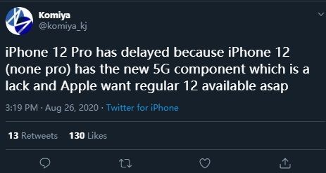 @IT之家【曝 iPhone 12 Pro 因 5G 基带供货问题或将面临延期】8月26日,知名爆料者 @@komiya_kj 今日表示,由于采用的新款 5G 部件短缺,iPhone 12 Pro (非 iPhone 12 Pro Max)已经延迟,而苹果对常规版本的 iPhone 12 付出了更多期望。而据爆料者 @iAppleTimes 补充,5G 调制解调器延迟,因此 iPhone 12 Pro 生产将于九月开始。