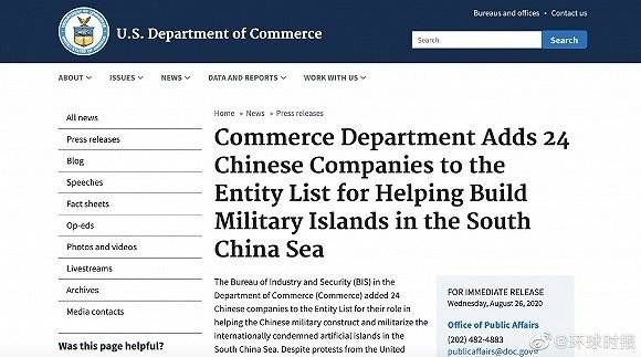 @界面新闻【美国宣布制裁24家参与在南海建岛的中国企业】《环球时报》官方微博消息,当地时间26日,美国商务部发布消息称,美国将24家中国企业列入制裁名单,原因是这些企业参与在中国南海领域修建人工岛。