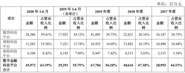 数字金融科技平台主要由微贷科技平台、理财科技平台和保险科技平台三大部分组成。截止至2020年上半年,微贷科技平台营收285.86亿元,占总营收39.41%;理财科技平台营收112.83亿元,占总营收15.56%;保险科技平台营收61.04亿元,占总营收8.42%。